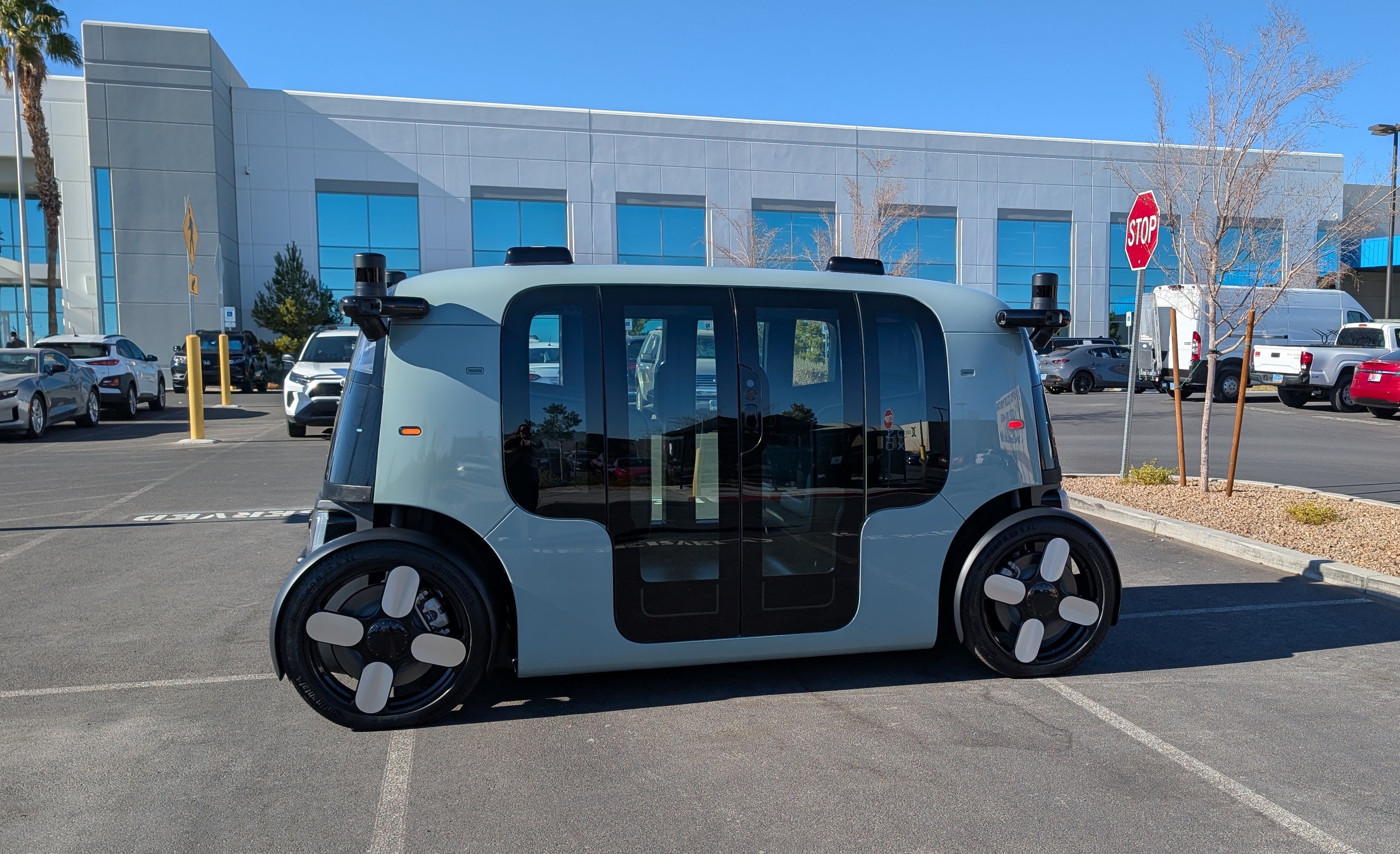I’m standing outside a nondescript corporate office park in Las Vegas next to a box-shaped vehicle with no proper front or back. It’s got a set of sliding doors, no steering wheel, and touchpad controls. It’s bidirectional, meaning it can move in either direction without turning around. And to be completely frank, it looks more like an oversized toaster than an actual car.